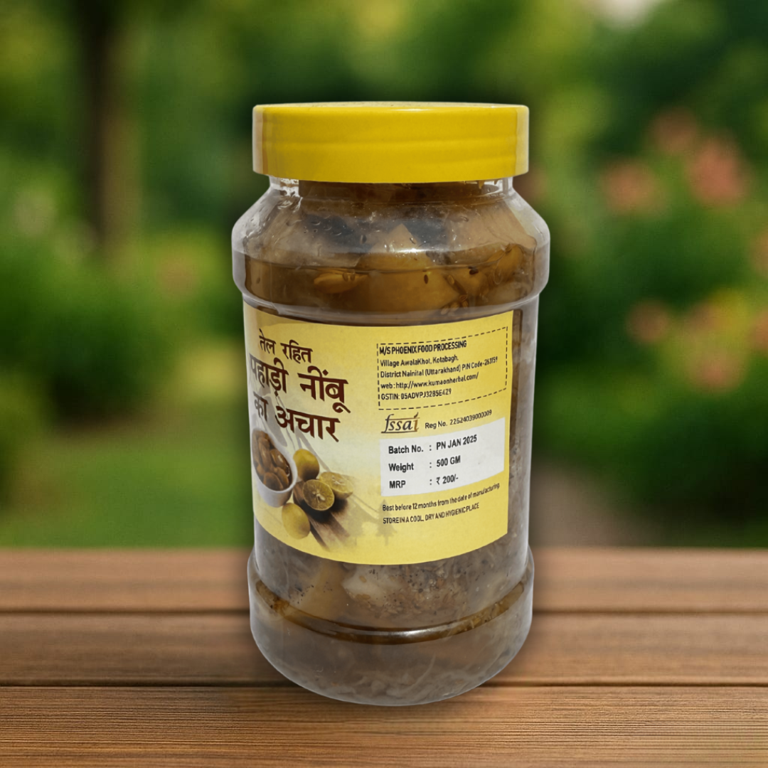In the heart of the Himalayas, where the air is crisp and the soil rich with minerals, grows the Pahadi Nimbu — a unique variety of Himalayan lemon known for its intense aroma, tangy flavor, and natural health benefits. Handpicked from the mountain orchards, these lemons are sun-cured and blended with Himalayan spices to create Kumaon Herbal’s Pahadi Nimbu Ka Achar — a true reflection of pahadi tradition and taste.